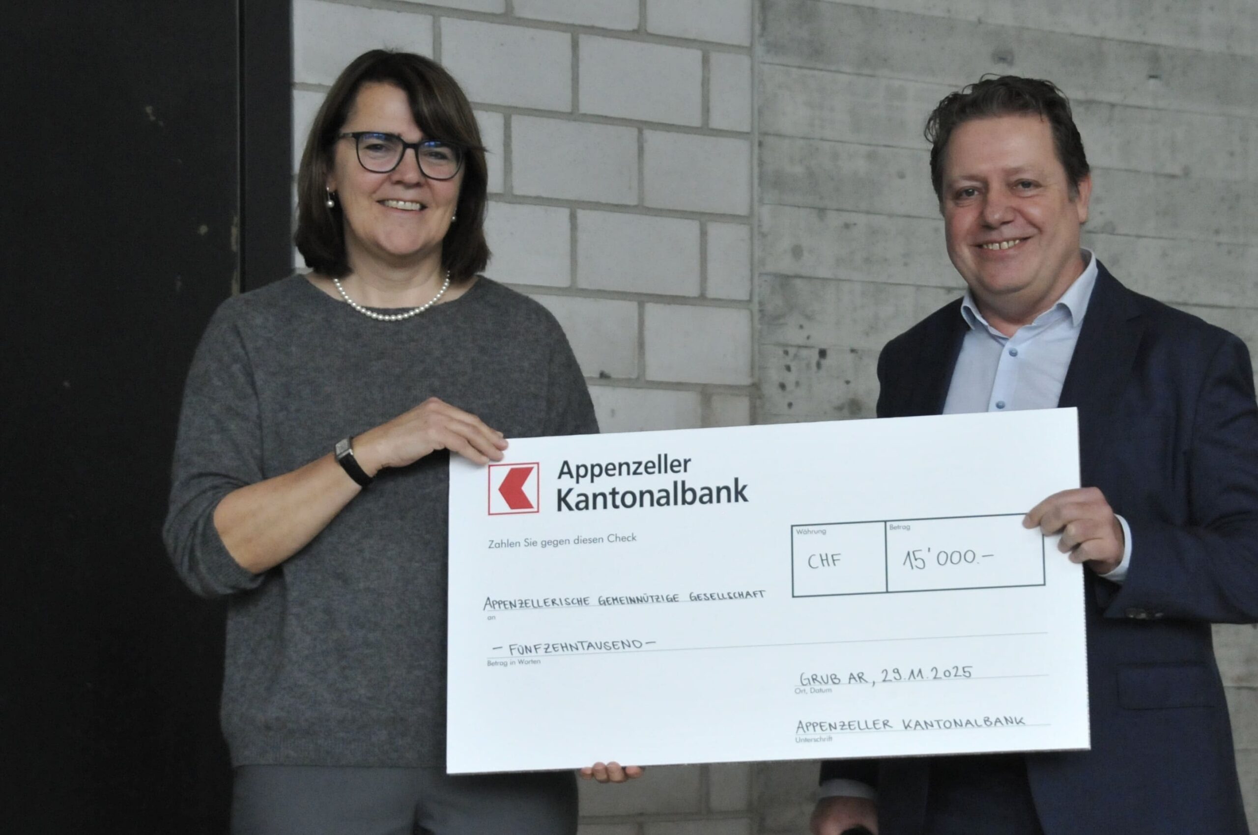 Im Zusammenhang mit ihrem 125-Jahr-Jubiläum setzte die Appenzeller Kantonalbank ein Anlagezertifikat «Pro Appenzellerland» auf, mit dem sie gemeinnützige Projekt in beiden Kantonen unterstützen möchte. Thomas Brägger (Bereichsleiter Anlagekunden) erläuterte, dass rund ein Drittel der üblichen Bankgebühren für diese Anlagen eingesetzt werde. Die Appenzeller Kantonalbank wollte diese Mittel aber nicht selbst verteilen. Mit der AGG habe man eine ideale und anerkannte Partnerin gefunden, welche die Zuweisung an kulturelle und soziale Engagements übernehme. Das Zertifikat sei sehr gut angekommen. Entsprechend überweist die Appenzeller Kantonalbank für 2025 bereits 15’000 Franken an die AGG. Im nächsten und in den Folgejahren könne mit einem doppelt so hohen Betrag gerechnet werden. Die Präsidentin bedankte sich anlässlich der symbolischen Checkübergabe für diese zusätzliche Einnahme, welche die Finanzierung der Aufgaben der AGG erleichtere und den Handlungsspielraum erweitere.